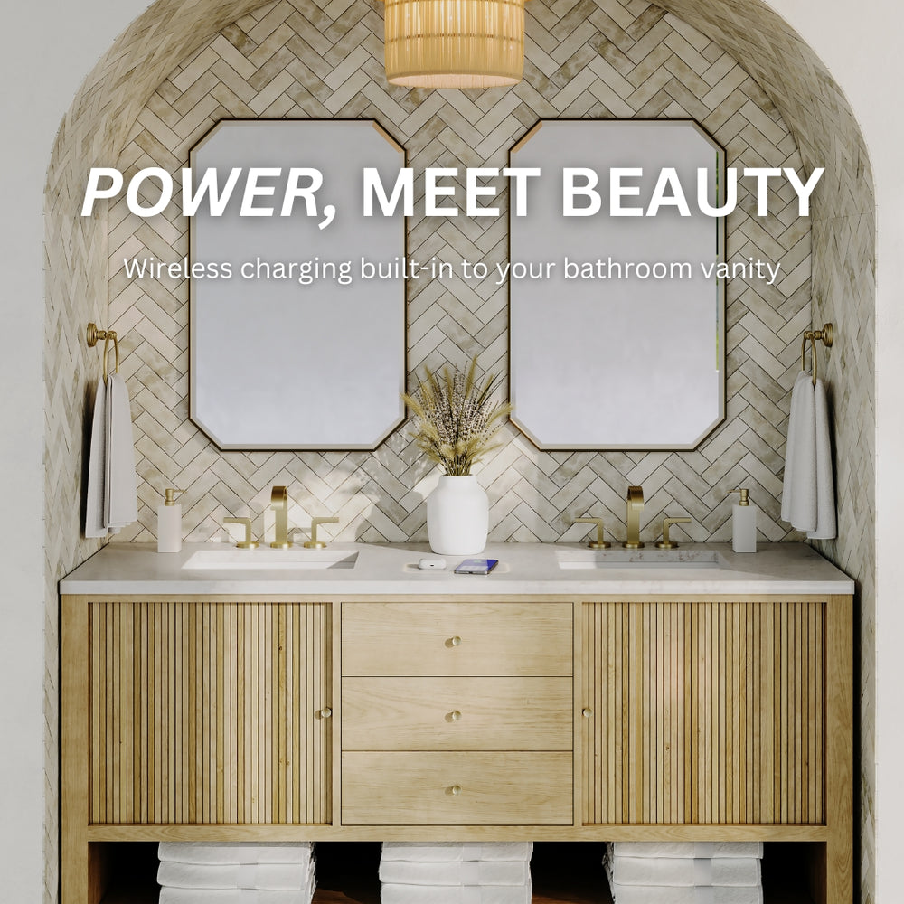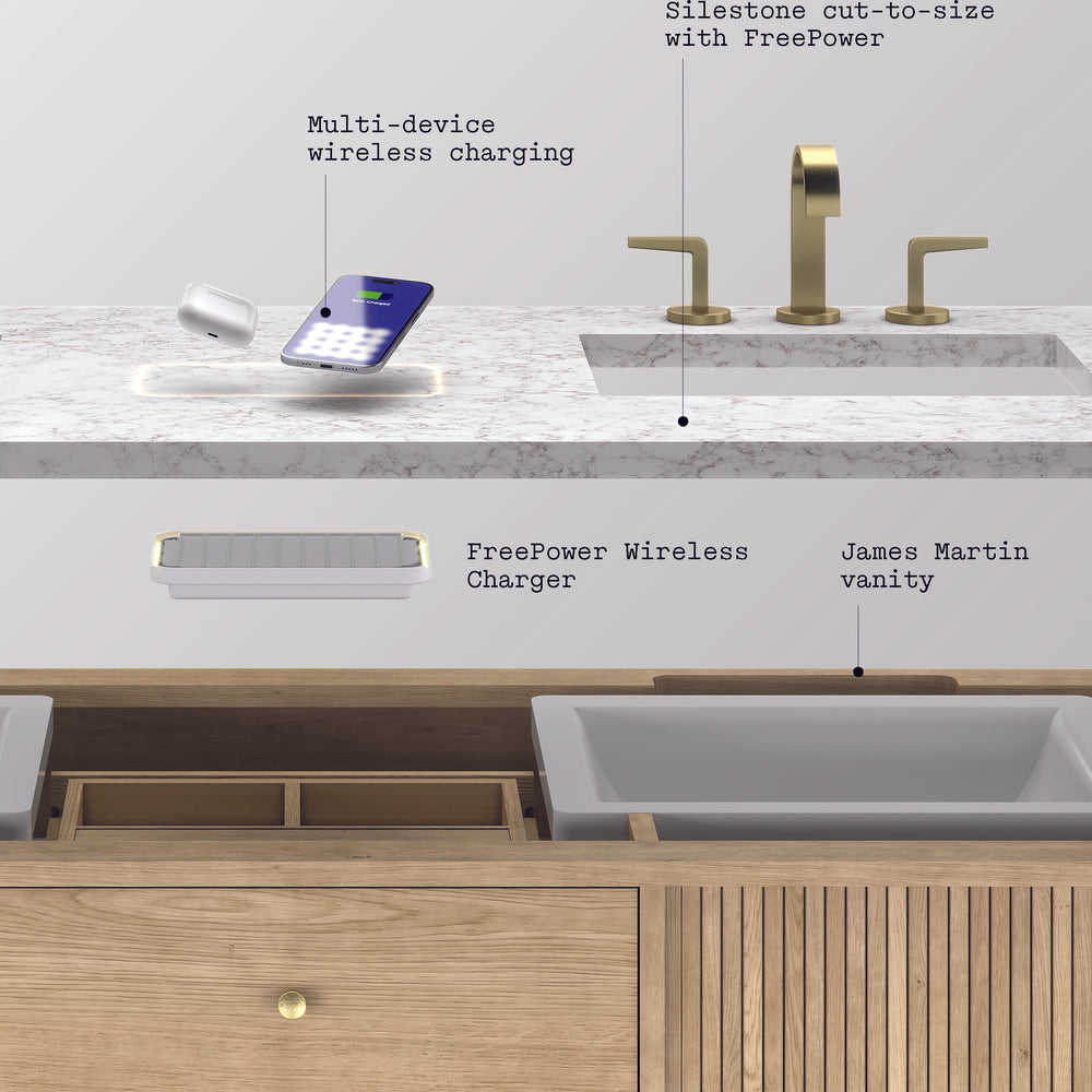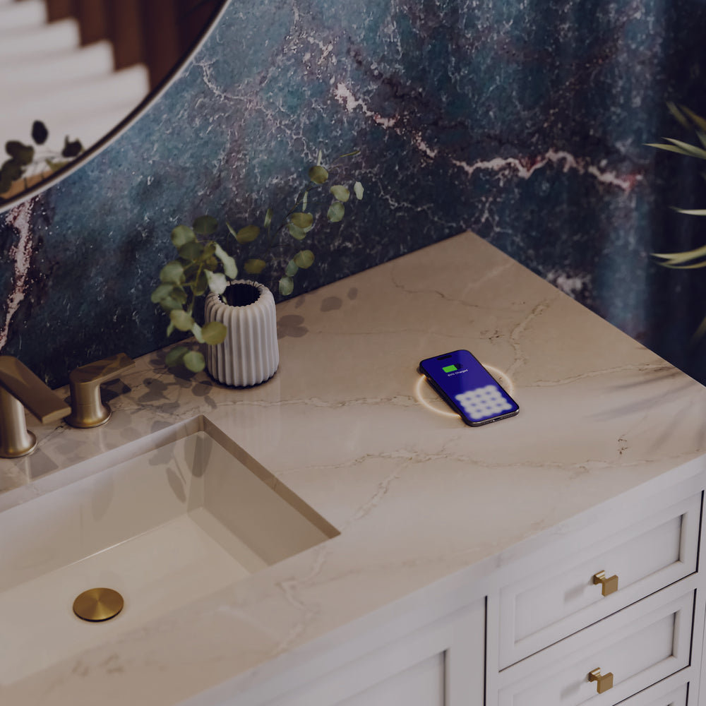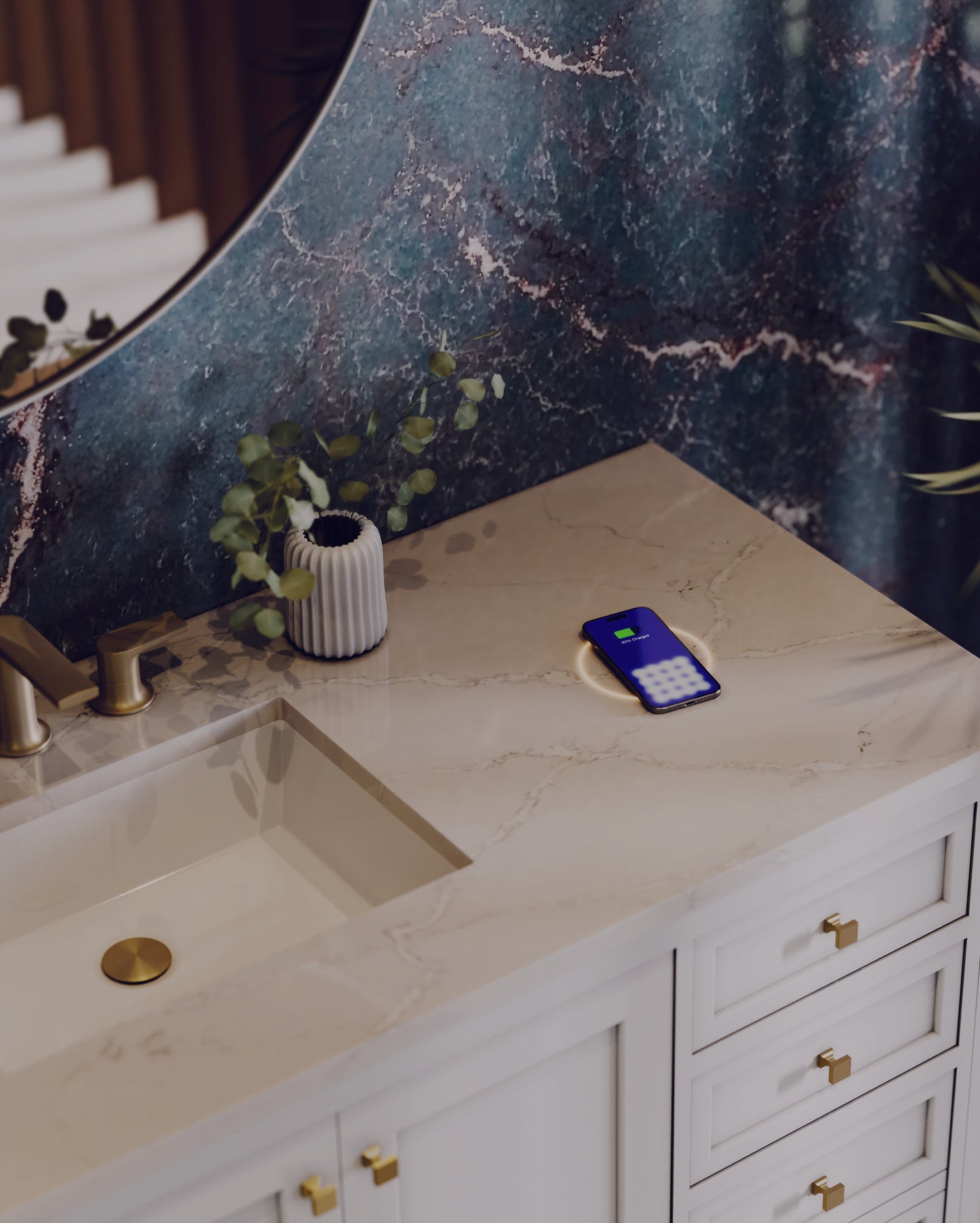 Your daily routine just got easier with the convenience of wireless charging in your bathroom vanity - integrating Freepower's state-of-the-art technology with stunning countertops by Cosentino. This innovative collaboration is set to redefine the industry, bringing unparalleled elegance and futuristic functionality to modern living.